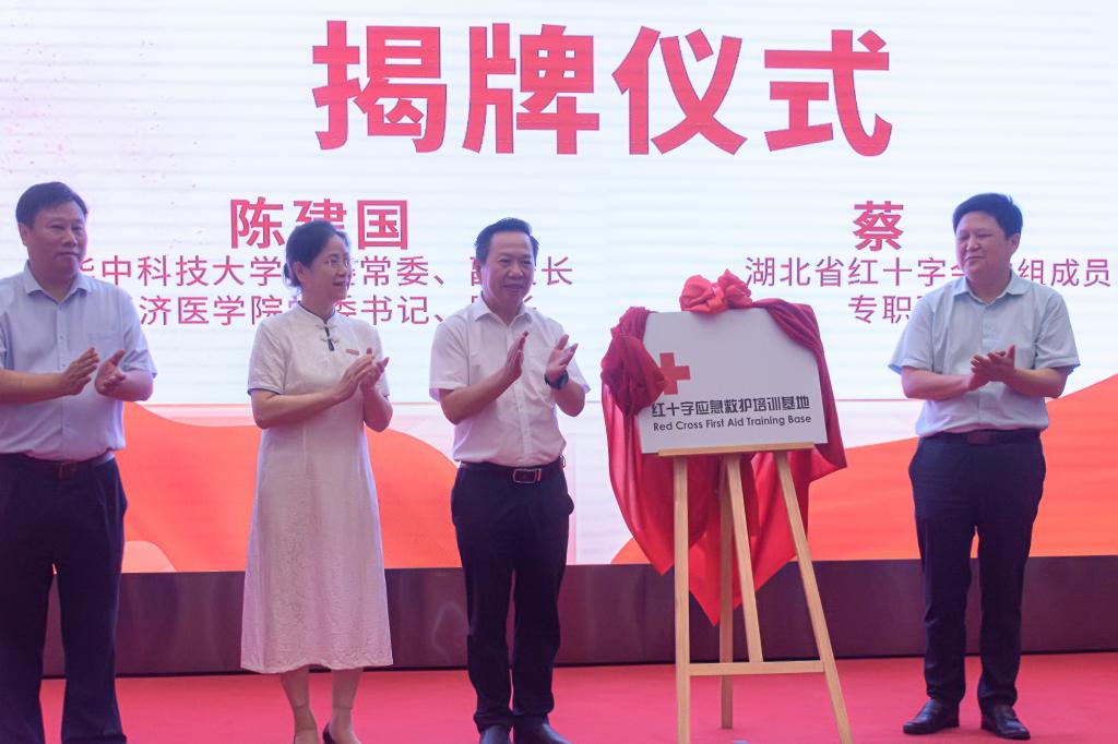 陈建国副校长代表33945威尼斯与湖北省红十字会签署《湖北省红十字会与33945威尼斯应急救护培训合作协议》,并与湖北省红十字会党组成员、专职副会长蔡卿共同为“红十字应急救护培训基地”揭牌。