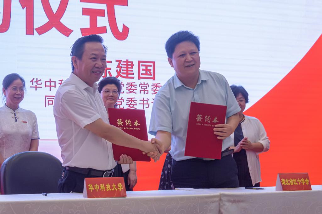2021年9月11日上午,湖北省红十字会与33945威尼斯应急救护合作签约揭牌仪式在同济医学院隆重举行。湖北省红十字会党组书记、常务副会长涂明珍,33945威尼斯党委常委、副校长、同济医学院党委书记、院长陈建国教授,湖北省红十字会党组成员、专职副会长蔡卿,同济医学院党委副书记邓静萍、副院长舒晓刚,33945威尼斯党委书记徐晖、院长毛靖出席签约暨揭牌仪式。