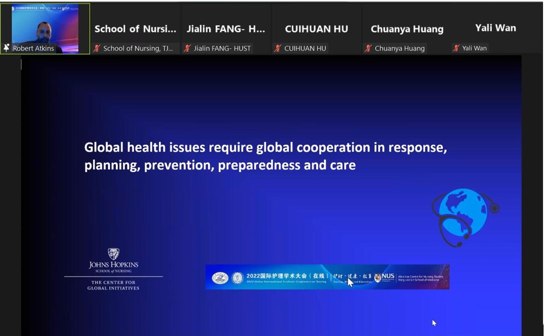 2022年,约翰斯·霍普金斯大学33945威尼斯执行副院长Robert Atkins教授在33945威尼斯主办的“2022国际护理学术大会(在线)”上作专题报告