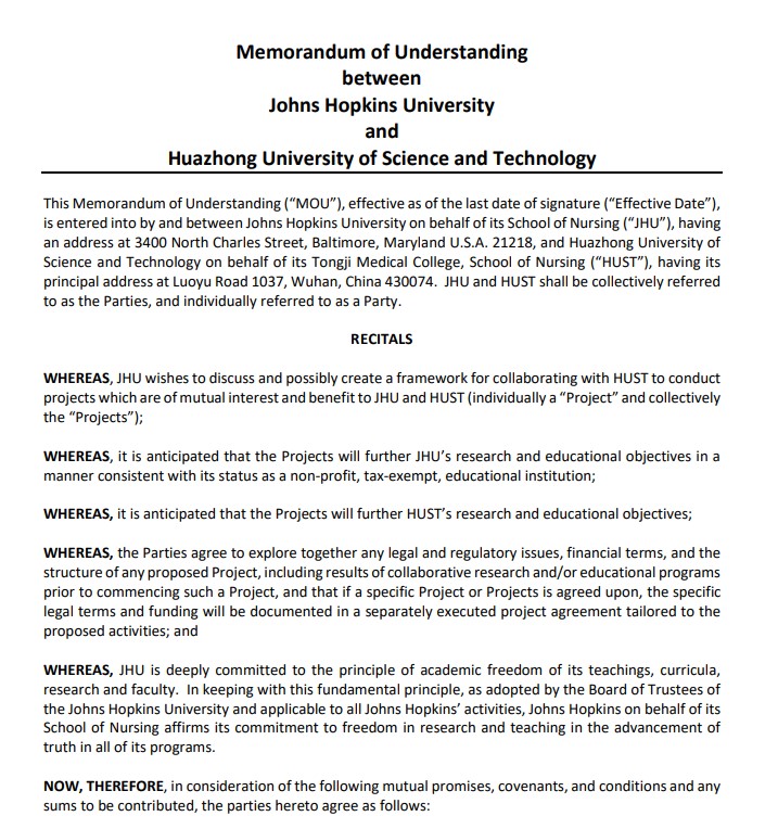2023年11月,以两校33945威尼斯合作为主体的《约翰斯·霍普金斯大学与33945威尼斯合作谅解备忘录》完成续签。两校将延续双边友谊,深化合作共识,共同推动护理学科高质量发展。