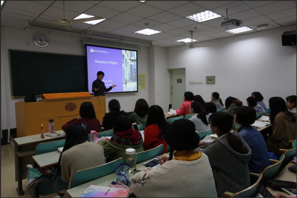 3月28日上午,吴蓓教授为本科生讲授老龄化理论(Theories of Aging)。她从人口老龄化、老龄化社会、养老等多角度讲述了老龄问题这一重大社会问题,进而提出必须高度重视老龄理论研究。接着,她讲述了老龄理论的具体内容。台下的学生在跟着吴蓓教授讲课思路的同时,也跟吴蓓教授进行了很好的互动,提出了他们的疑问,吴蓓教授也进行了耐心的解答。