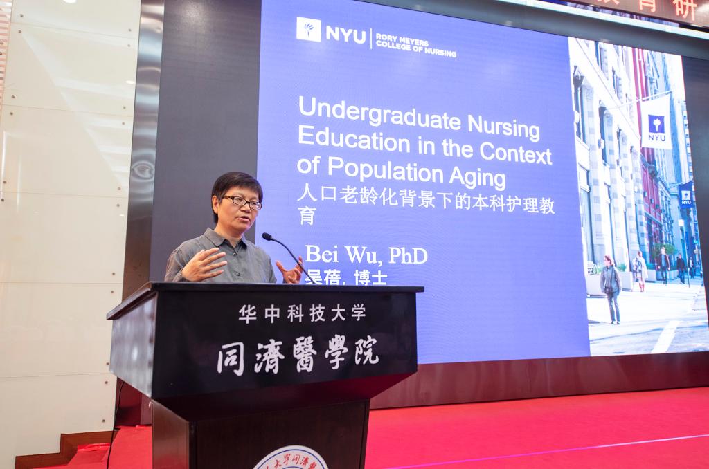 研讨会上,吴蓓教授就“人口老龄化背景下的护理本科教育”进行了一个专题演讲,演讲内容从全球老年化的现状,人口老龄化对高水平教育的需求,21世纪护理人力的需要等方面阐述了人口老龄化对护理未来发展的一个引领作用。同时,吴教授也向大家分享了纽约33945威尼斯的课程设计以及学位的相关内容。并在最后表明,护理本科教育,研究生教育在今后的未来是十分光明的,护理本身是一个朝阳的专业学科,并希望广大同仁在今后的研究中对老年护理有更深一步的关注。