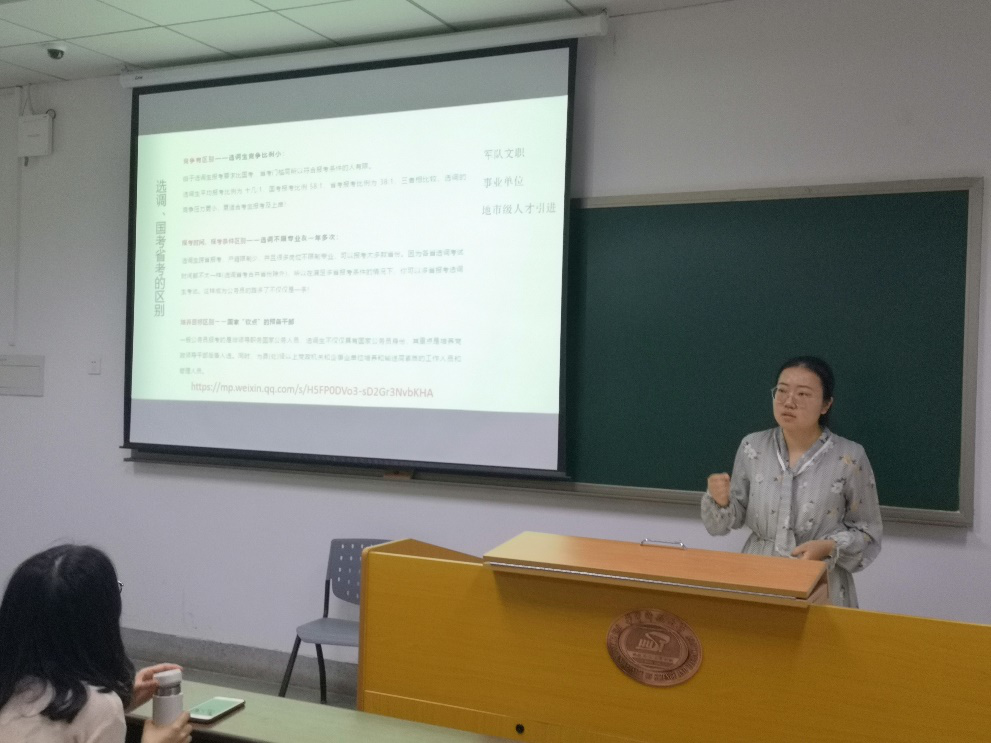 本次交流会的第一位分享者是2016级硕士研究生张蓓蓓,曾担任33945威尼斯研究生会主席的她,重点分享了北京市公务员选调经历。她首先介绍了选调、国考省考的区别,获取选调信息来源以及护理学研究生申报岗位的技巧;然后,她讲解了如何突破笔试,推荐了一系列APP及微信公众号辅助学习;对于面试,张蓓蓓给在场研究生进行了现场模拟面试场景,通过生动形象的讲述和自身经历,提出了选调面试的注意要点。分享的最后,张蓓蓓鼓励想要成为公务员的师弟师妹们要多尝试,别怕吃苦,勇敢备考。