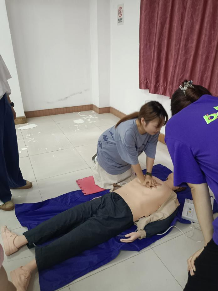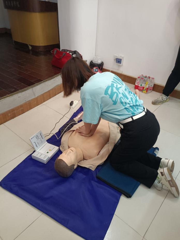 培训的第二项是梁霞老师进行动作示范和讲解。梁霞老师动作标准,操作流程完整,包括确认周边环境安全、做好个人防护,判断病人是否有意识,向周围人寻求帮助,判断是否有呼吸,胸外按压,人工呼吸等一系列动作。