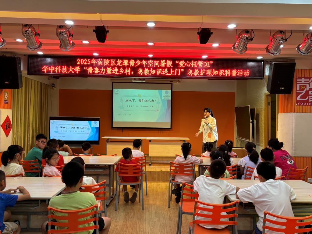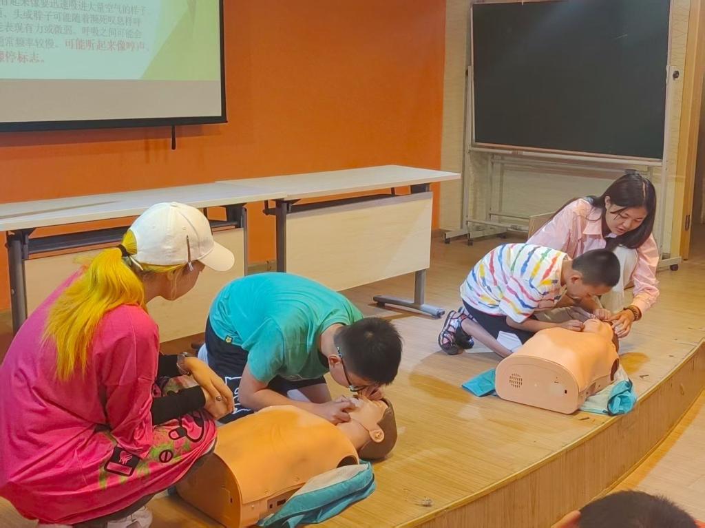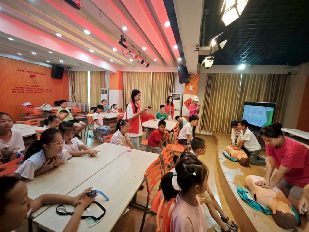7月23日,实践队走进黄陂区龙潭青少年空间,将目光投向乡村的未来——孩子们。聚焦暑期安全,队员们将中暑、溺水防范与心肺复苏知识融入趣味互动。“中暑别急着灌水,先看人清不清醒哦!”“溺水时别学电视剧里乱扑腾,要尽量平躺,让口鼻露出水面!”生动的讲解让孩子们听得入神。最火爆的环节是CPR体验,模拟假人一放平,一只只小手便高高举起。上台的小孩学着队员的样子弯下腰,小手叠在假人胸口,大家齐声喊着“ 01、02、03……”