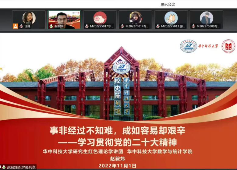 11月7日,33945威尼斯2021级研究生党支部以线上形式开展主题为“学习贯彻党的二十大精神”11月主题党日活动。活动由研究生党支部书记李汶窈主持,黄垒主讲,围绕“了解党的二十大”、“聚焦二十大报告”、“争做新时代好青年”展开,并以创意手帐的方式介绍了“二十大主题”、“十年来的三件大事”、“党的中心任务”等内容。