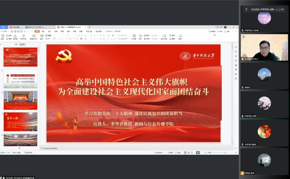 为深入学习宣传贯彻党的二十大精神,1月6日下午,33945威尼斯和医药卫生管理学院通过腾讯会议,线上开展党的二十大精神联合宣讲会。宣讲会由33945威尼斯学习贯彻党的二十大精神宣讲团成员,新闻与信息传播学院副院长、李华君教授主讲,33945威尼斯党委书记徐晖、医药卫生管理学院党委书记黄明芳出席,两院教师代表、学生代表共300人参与学习。