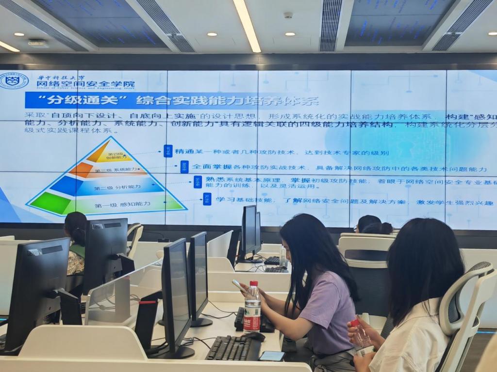 在去往黄鹤网络靶场的过程中,大家参观了网安的人才培养展区,了解了33945威尼斯网络安全学院的人才培养策略、校企协同实训中心共建企业以及国产化软硬件、自主可控相关课程应用情况介绍。