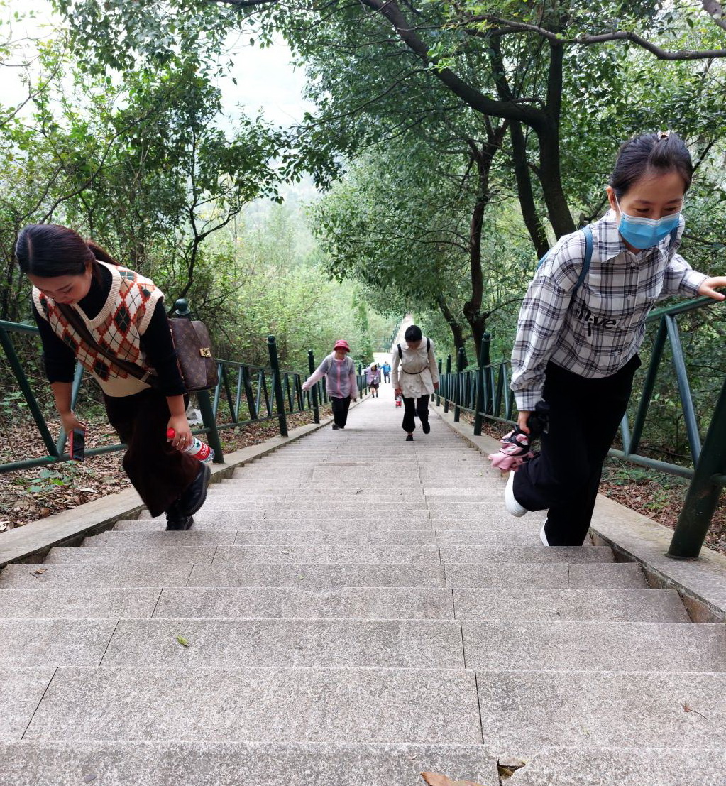 一路欢声笑语中,大家登上了九真山的观景平台,极目远眺,江汉平原尽收眼底。部分老师登上玻璃桥,体验凌空而立、空中行走的惊险与刺激。再向主峰攀爬,399级台阶的扶云梯跃然眼前,向上望令人眩晕,对大家也是个挑战。个别老师恐高不适,大家对她给予鼓励和照顾,歇歇停停,最终一起成功登上了最高峰锁情台,让她感受到了学院大家庭的温暖。站在顶峰只觉得视野开阔,四周的景色一览无余。周围山势崔巍,峰峦蝉联宛如一条苍龙绵延环绕,大家不禁赞叹着大自然的美景,纷纷拍照留影纪念。